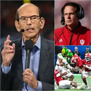 After Indiana’s stunning 56–22 demolition of Oregon, the most explosive moment came not from the scoreboard but from the studio, as Paul Finebaum unleashed a scorching on-air attack that sent shockwaves through college football. Dismissing the win as anything but authentic, he declared, “That win wasn’t earned — it was purchased,” accusing Indiana of overpowering Oregon not with development or toughness, but with NIL money and a system he called fundamentally broken. As the backlash spread rapidly across social media, the controversy reached its peak — until Indiana head coach Curt Cignetti stepped to the podium and dropped a single, icy 11-word sentence that instantly shifted the entire narrative.
