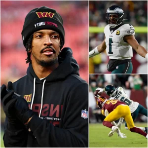 “HE IS A CHEATER, HE DOESN’T DESERVE TO PLAY IN THIS PRECIOUS SPORT!” Just seconds after the humiliating 18-29 loss to the Philadelphia Eagles at Northwest Stadium, Washington Commanders quarterback Jayden Daniels, his face flushed with anger, pointed directly at Jalen Hurts and loudly accused the Philadelphia Eagles star of using high-tech equipment to “cheat,” demanding an immediate NFL investigation. Five minutes later, in front of dozens of television cameras, the Philadelphia Eagles player slowly lifted his head, a cold smile on his face, and uttered exactly 15 scathing sentences. The entire stadium seemed to erupt in chaos, and Jayden Daniels stood there speechless, his face pale, before millions of NFL fans worldwide watching.