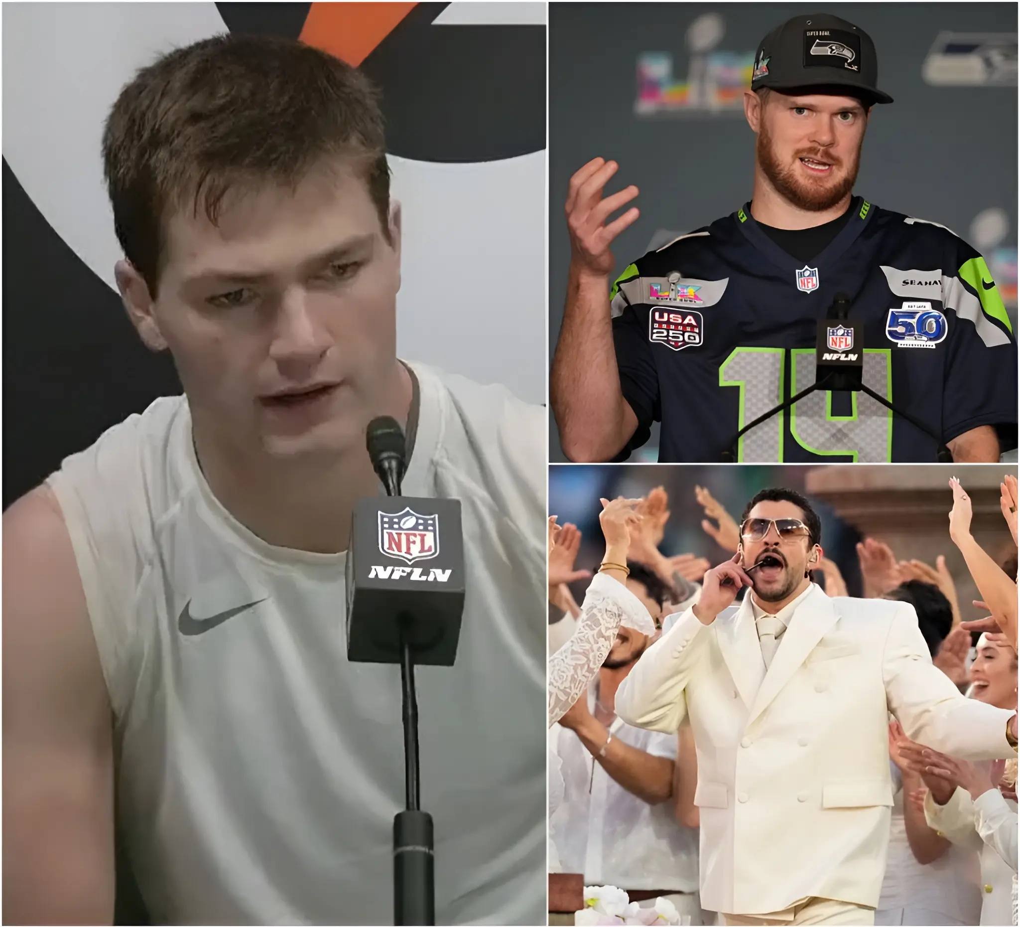 🚨 BREAKING NEWS: After the Patriots’ bitter defeat, star quarterback Drake Maye sparked controversy by claiming the team failed to perform at its true level after halftime due to being affected by Bad Bunny’s halftime show. He suggested that the disruption in rhythm and mindset caused New England to completely lose control of the game in the second half. The remarks quickly ignited heated debate across the NFL, with many arguing it sounded like an unacceptable excuse on the sport’s biggest stage. Refusing to let the narrative linger, Seahawks star Sam Darnold responded almost immediately. With a single short but pointed remark, he made it clear that the difference between champions and losers lies in adaptation, not postgame explanations.