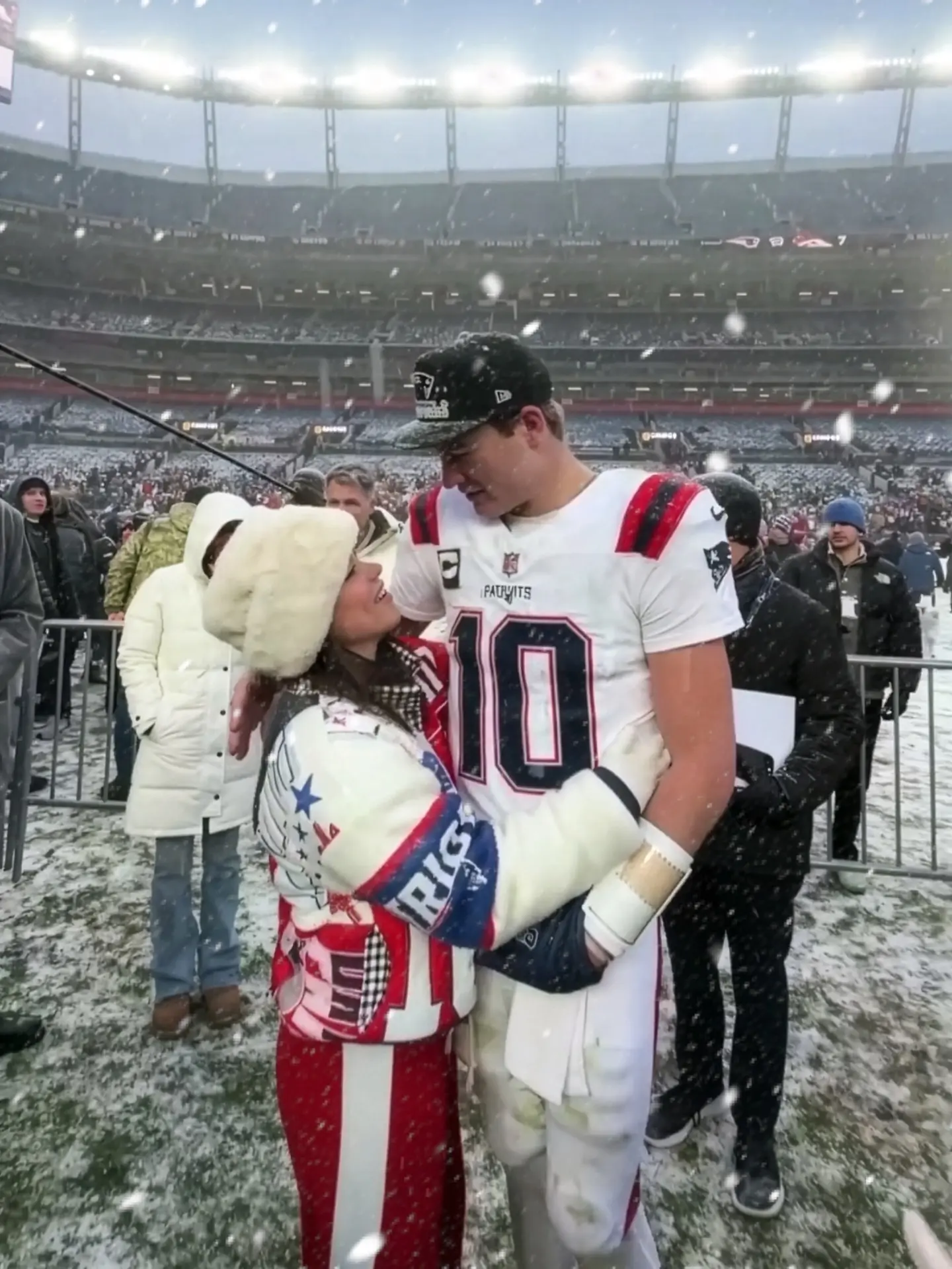 Her appearance in a fur coat during the divisional-round playoff game against the Houston Texans became iconic. Underneath the coat was a sweatshirt that simply read “I Heart Drake Maye.” No irony, no wink—just genuine belief, worn at the perfect time in a high-stakes January game. In the cold, pressure-filled atmosphere of the playoffs, that kind of straightforward support resonates deeply.