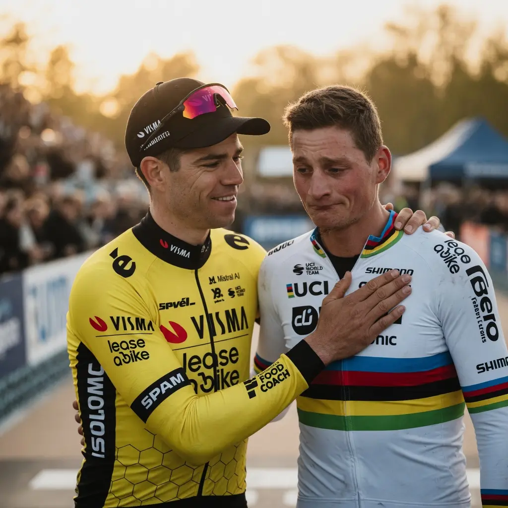 Wout van Aert liep langzaam naar hem toe, knielde naast hem neer en legde zijn hand op zijn schouder. Het was geen dramatisch gebaar, geen actie bedoeld voor de camera’s. Integendeel, het was stil, oprecht en bijna intiem. Hij fluisterde iets in het oor van zijn rivaal — woorden die niemand volledig kon horen, maar waarvan de impact onmiddellijk zichtbaar werd.