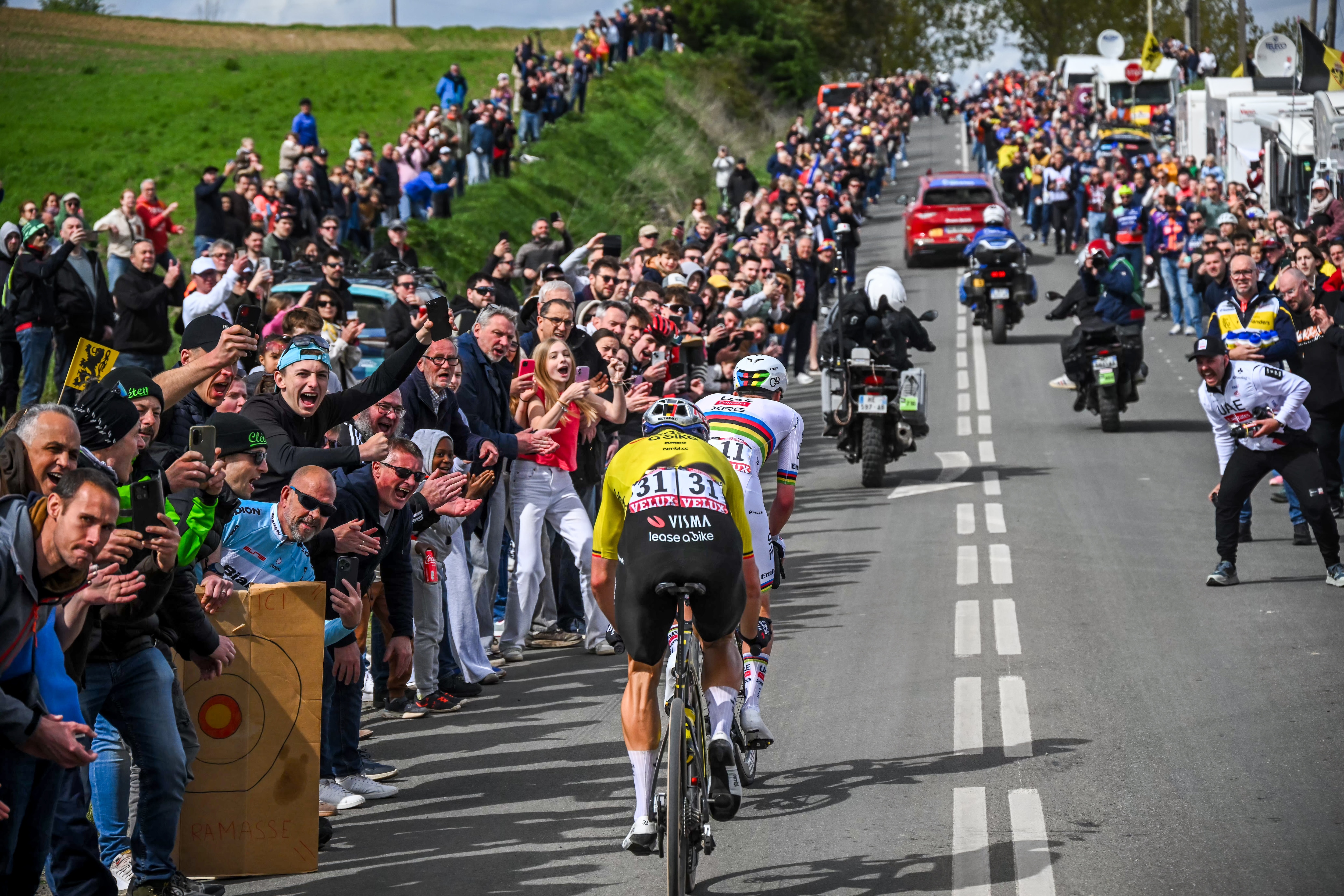 Eerst nog de kasseien van Willems à Hem, waar beide heren de grote risico’s duidelijk schuwen.16:10NOG 12 KM – Op naar sprintduel op de piste?Het ergste gedokker over de kasseien is achter de rug: met een halve minuut voorsprong lijken we zo op weg naar een sprintà deuxop de legendarische Vélodrome André Pétrieux in Roubaix.16:03NOG 17 KM – Vlieg- en stuntwerkOp Carrefour de l’Arbre trekt Pogacar andermaal stevig door. In een linke bocht bekoopt hij die inspanning ei zo na met een valpartij, maar ook Van Aert houdt zich knap recht en geeft de Sloveen geen centimeter ruimte.