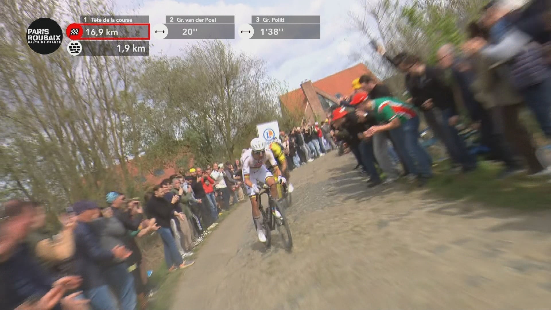 © Sporza16:02NOG 18 KM – Van der Poel en co naderenOp Camphin-en-Pévèle blijft een nieuwe versnelling uit vooraan, waardoor Van der Poel en co zowaar steeds dichter komen. 23 seconden is het verschil!15:57NOG 23 KM – Spaarstand op de kasseienKortere en meer geplaveide kasseistroken luiden de absolute finale in. Het moment voor Van Aert en Pogacar om nog wat energie te sparen op weg naar Roubaix.