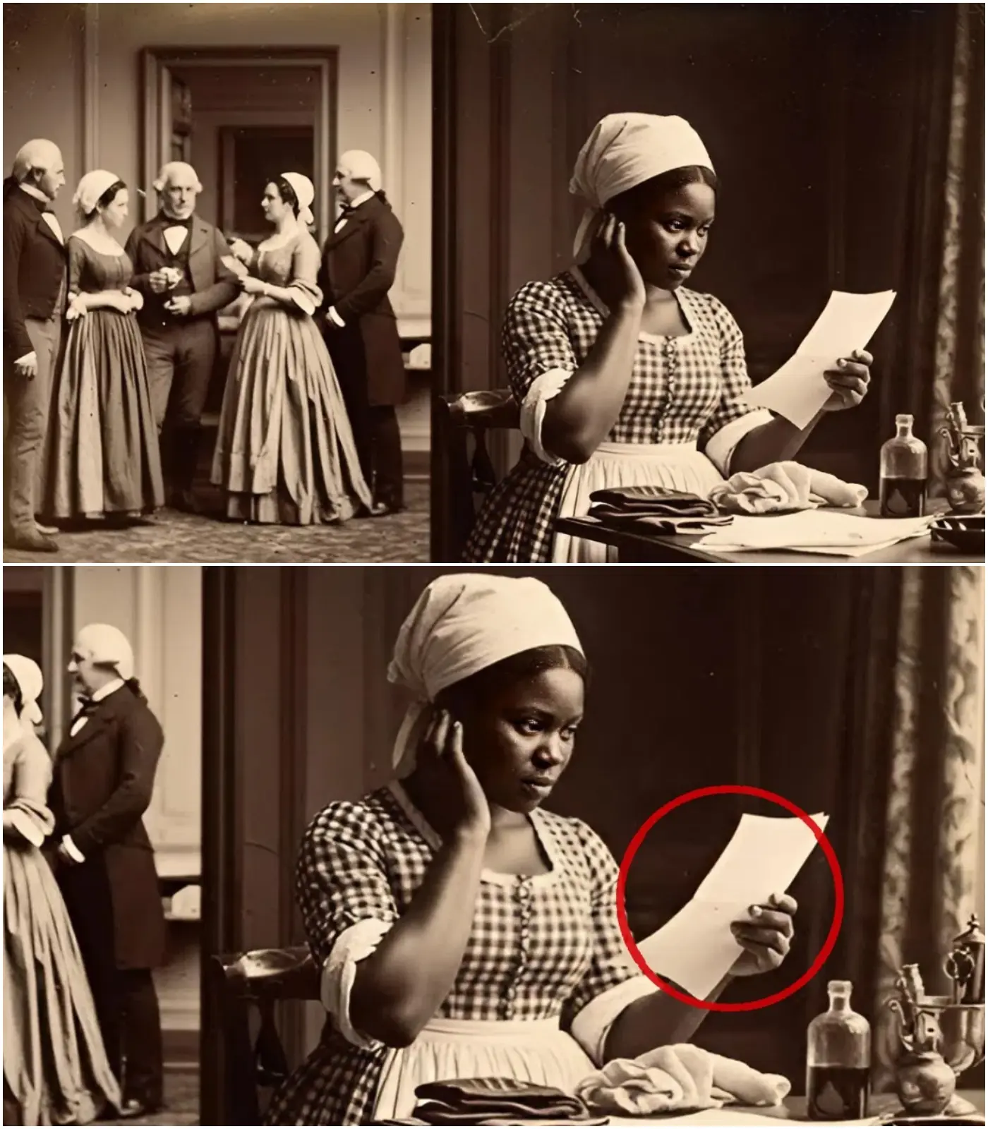 في إحدى الليالي الممطرة من عام 1845، نسي السيد مفاتيحه على طاولة المدخل بعد أمسية طويلة من الشرب مع الضيوف. سقطت المفاتيح بصوت خفيف، لكن في صمت الليل بدا ذلك الرنين كصرخة. لويزا كانت في طريقها إلى الكوخ بعد انتهاء عملها اليومي الطويل. رأت الوميض المعدني تحت ضوء القمر الخافت. ترددت لحظة. قلبها كان يدق بقوة حتى شعرت به في حلقها. ثم، كظل بلا صوت، تقدمت. أمسكت بالمفاتيح. صعدت الدرج الخلفي بحذر شديد، متجنبة الألواح التي تصدر صريراً. وصلت إلى باب مكتب السيد.