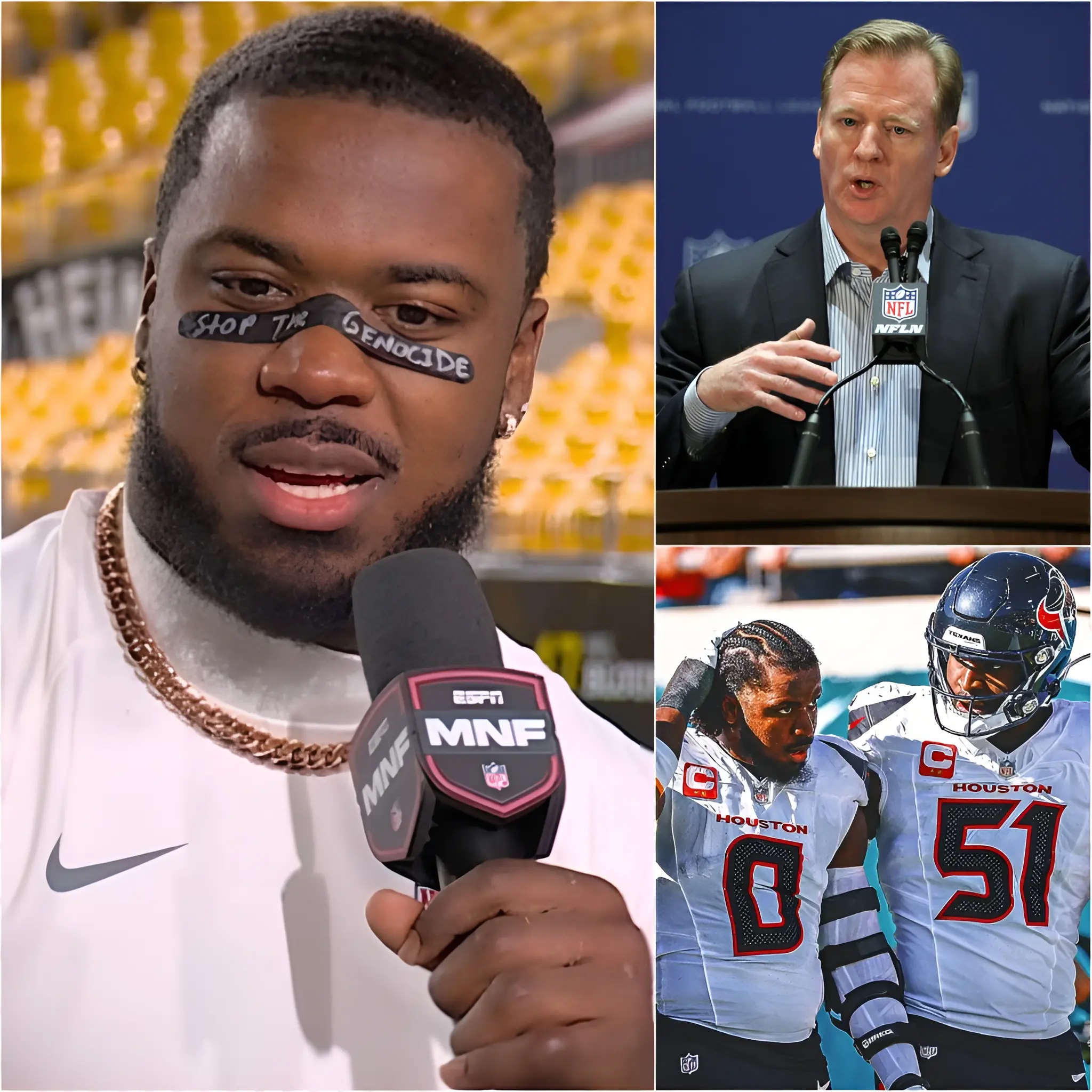 The controversy stems from the Wild Card playoff game against the Pittsburgh Steelers, where Al-Shaair took the field with a bold message painted across his face. In stark white letters against the black grease, the words “STOP THE GENOCIDE” were clearly visible to millions of viewers worldwide.