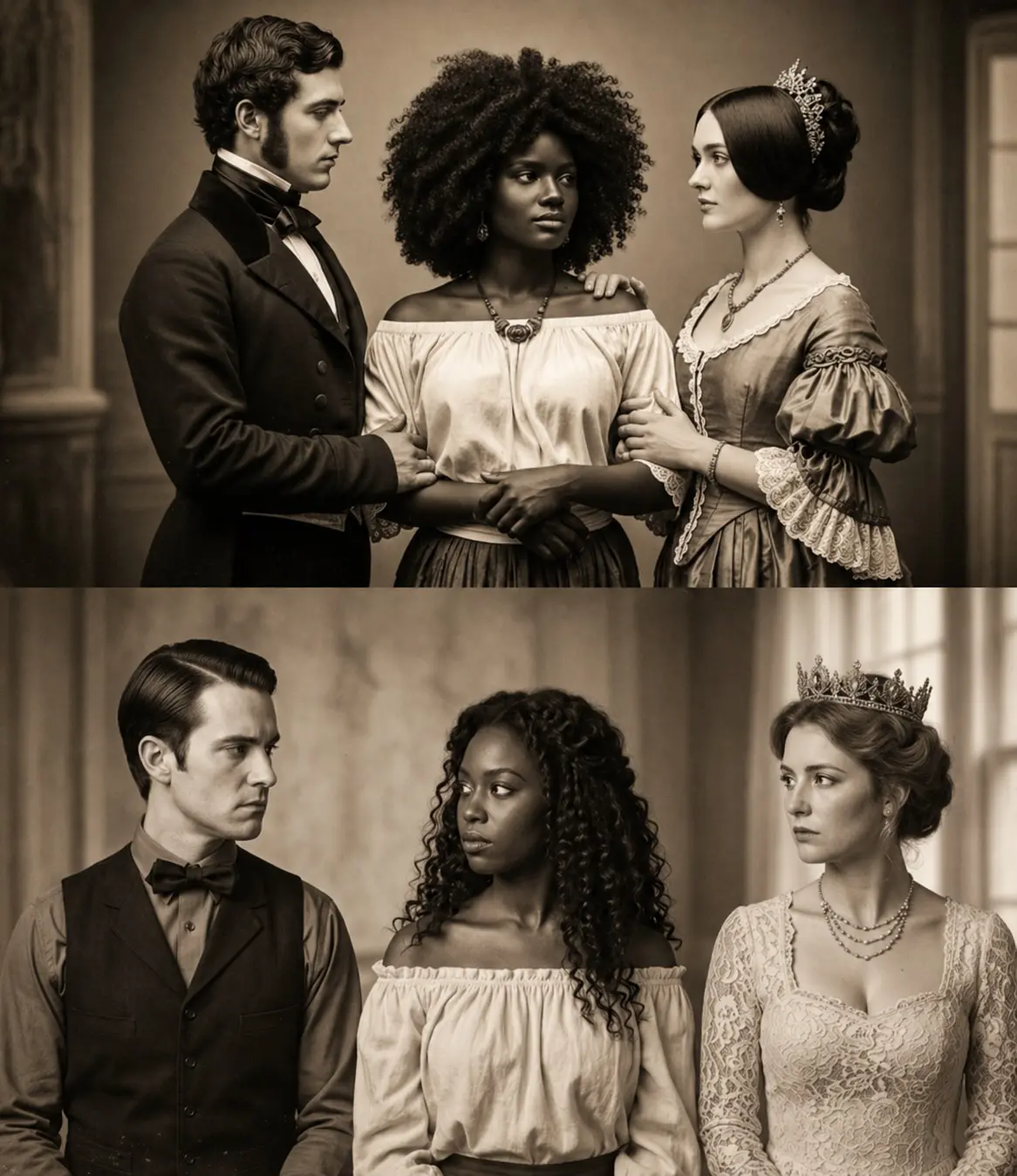 Le triangle se forma sans consentement véritable. D’un côté, une femme légitime cherchant à préserver son statut. De l’autre, un homme consumé par ses désirs. Et au centre, une esclave piégée, privée de choix, subissant les conséquences de forces opposées.