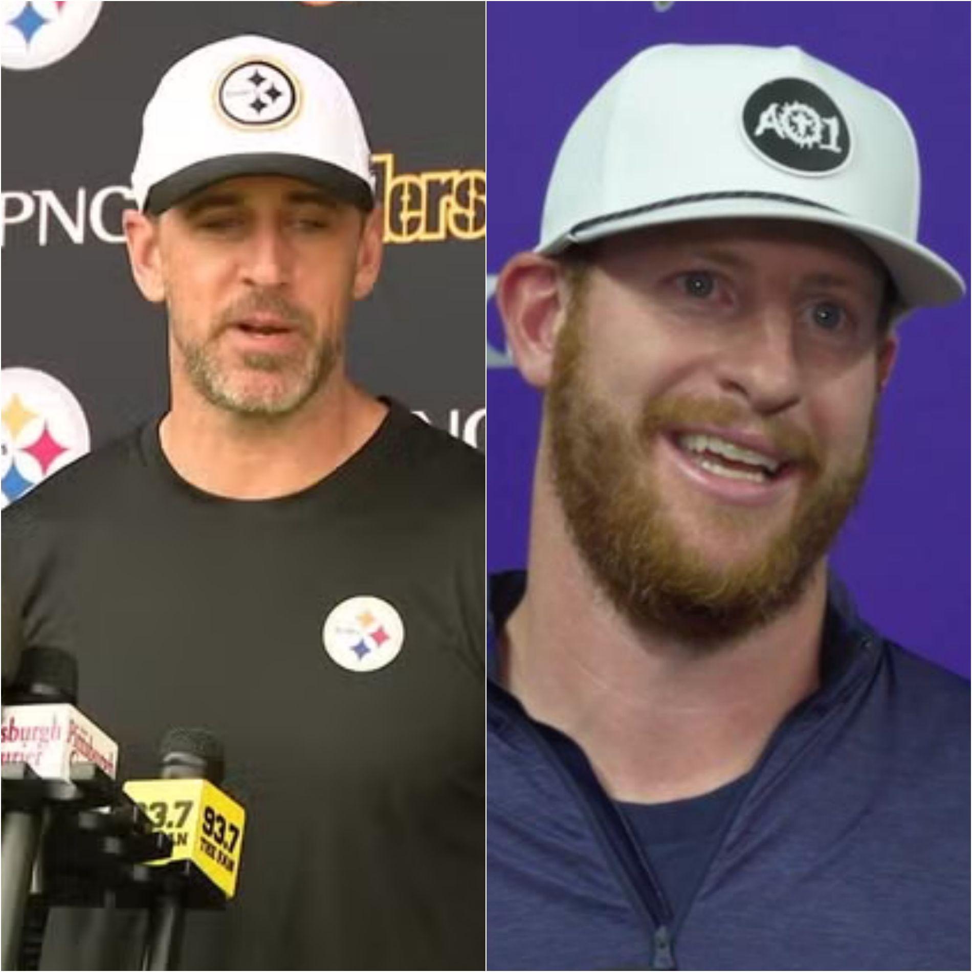 🔥 QB WAR IGNITES 🔥 Steelers legend Aaron Rodgers lit the fire by mocking Carson Wentz as “just a backup collecting dust,” 😱 but the Vikings QB didn’t stay silent — Wentz snapped back with a savage one-liner that left Rodgers stunned and the entire locker room in shock, sending fans into a frenzy as the war of words explodes beyond the field!