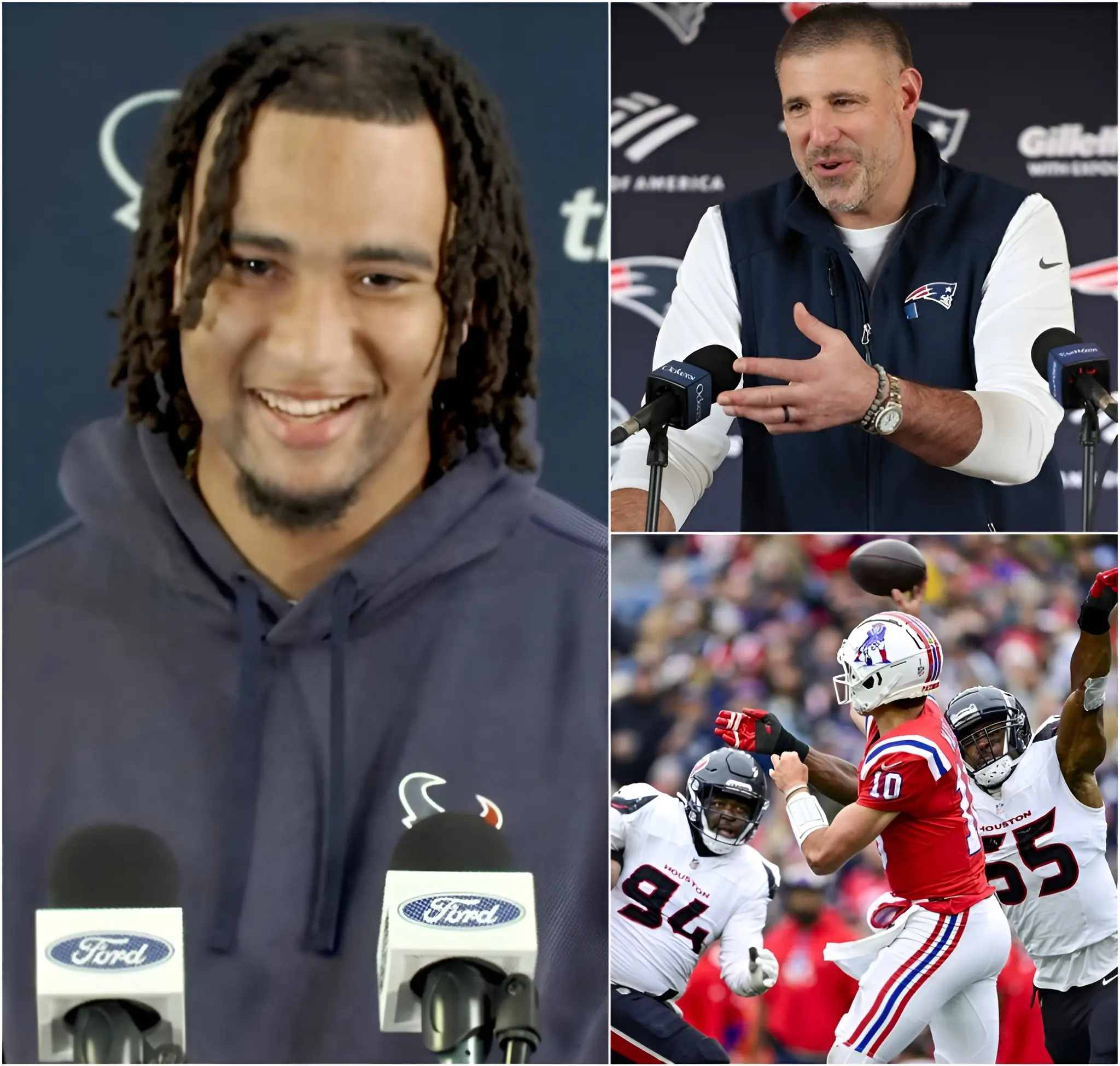 SHOCKING NEWS: C.J. Stroud has unexpectedly filed a complaint accusing the Patriots of using a laser targeting device from the sideline to help Drake Maye align targets and improve passing accuracy. He claimed this represents a modern form of technological cheating, especially dangerous under strong lighting conditions and intense competitive pressure. The allegation spread rapidly across the NFL, igniting fierce controversy. Patriots head coach Mike Vrabel immediately fired back, calling it “cheap drama from the visiting team” and insisting that New England wins with talent, not lasers. Tensions have now been pushed to a boiling point ahead of an already heated matchup.