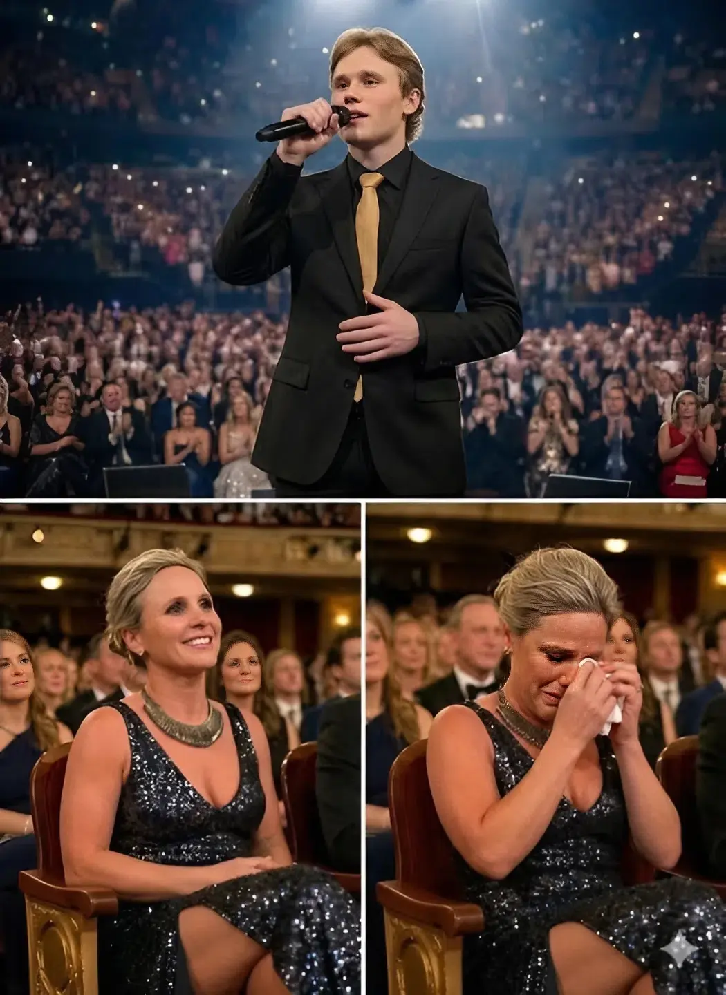 His mother’s reaction came almost instantly, her composure dissolving as tears welled up in her eyes, overwhelmed not by spectacle but by the raw honesty pouring from the stage in every lyric he delivered.