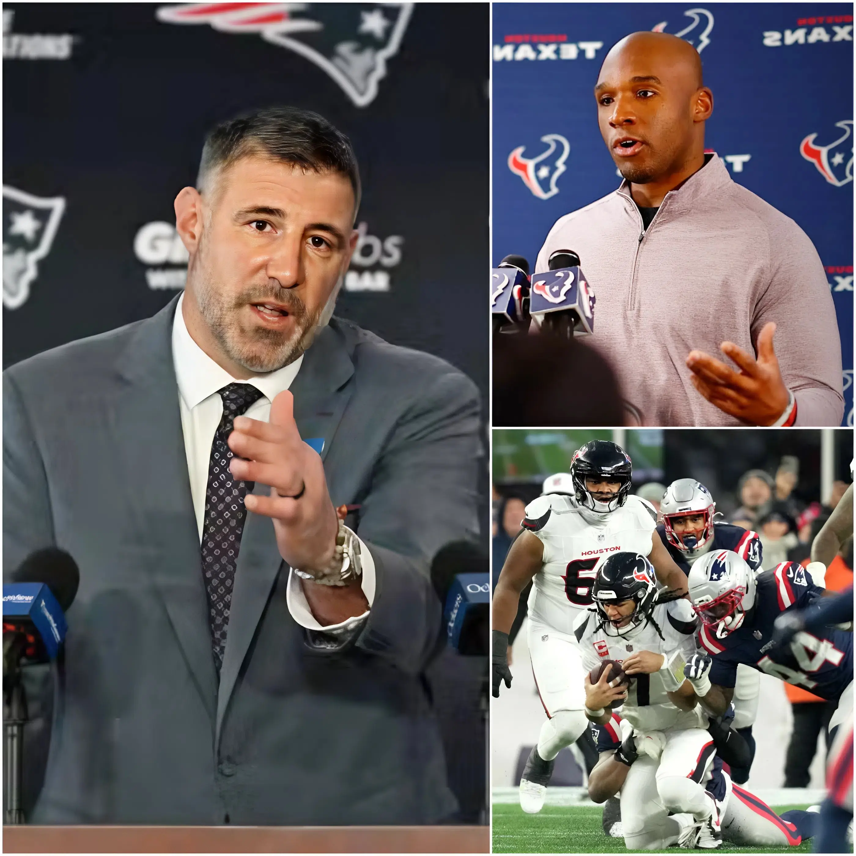 🔥🚨 “You should all shut up! That was a cheap victory built on dirty tricks, nothing to be proud of at all” — with a piercing stare and an unyielding tone, head coach DeMeco Ryans officially fired back at the wave of malicious criticism aimed at the Houston Texans following their bitter defeat to the New England Patriots, bluntly accusing the Patriots of using underhanded tactics to secure the win; however, less than five minutes later, head coach Mike Vrabel calmly stepped forward with a sharp rebuttal and presented a specific, hard-to-dispute piece of evidence that completely flipped the narrative, exposing the baseless accusations and sending public opinion into an unprecedented spiral of tension, division, and explosive debate